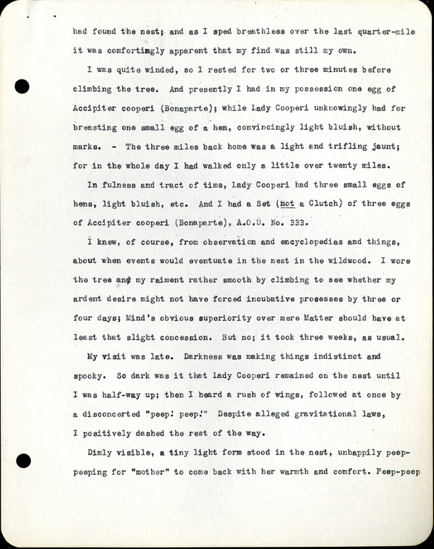 I was quite winded, so I rested for two or three minutes before climbing the tree. And presently I had in my possession one egg of Accipiter cooperi (Bonaparte); while Lady Cooperi unknowingly had for breasting one small egg of a hen, convincingly light bluish, without marks. – The three miles back home was alight and trifling jaunt; for in the whole day I had walked only a little over twenty miles.