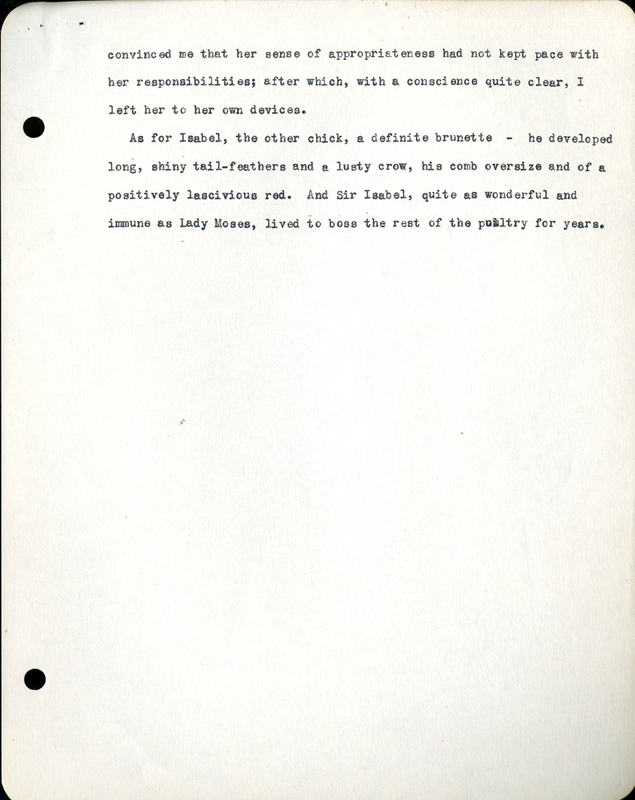 As for Isabel, the other chick, a definite brunette – he developed long, shiny tail-feathers and a lusty crow, his comb oversize and of a positively lascivious red. And Sir Isabel, quite as wonderful and immune as Lady Moses, lived to boss the rest of the poultry for years.
