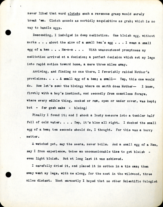 Descending, I indulged in deep meditation. One bluish egg, without marks . . . about the size of a small hen’s egg . . . I mean the small egg of a hen . . . Hm-m-m . . . With unaccustomed promptness my meditation arrived at a decision; a perfect decision which set my legs into rapid motion toward home, a mere three miles away.