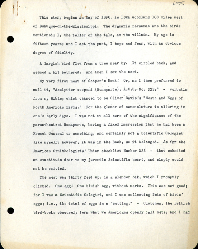 This story begins in May of 1890, in Iowa woodland 100 miles west of Debuque-on-the-Mississippi. The dramatis personae are the birds mentioned; I, the teller of the tale, am the villain. My age is fifteen years; and I act the part, I hope and fear, with an obvious degree of fidelity.