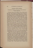 CHARLES EDWIN BESSEY PROFESSOR OF BOTANY AND DEAN OF THE INDUSTRIAL COLLEGE 1884-1915. Professor Bessey was notified in June, 1884, that he had been elected professor of botany in the University of Nebraska. He was then at Ames College, Iowa. The selection had been made by the regents of the University without his knowledge, but he was sufficiently interested in the incident to come to Lincoln "to look the place over." During that first visit to the University he found that nothing had been done along botanical lines and he was quite naturally reluctant to have the accumulation of his fifteen years' labor at Ames to go to a new state to build up a new department from the very beginning. So he told the regents that they were not ready for him and declined the offer of the professorship. A second offer, extended in August of the same year, included the deanship of the industrial faculty or college as well as the professorship of botany. After another trip to Lincoln and a consultation with the board of regents Professor Bessey accepted the second call and his inaugural address was delivered at the University in September, 1884. He began his active class work at the University in January, 1885. His first thought was always with the work of his classes in lecture room and laboratory and except for a few brief interruptions he continued that work to the beginning of his final illness. Much of Dr. Bessey's energy was devoted during the earlier years of his work in Nebraska to the collection of the grasses and other economic plants of the state. He made many talks on grasses, weeds, plant diseases, the methods of improving plants and the possibilities of a better agriculture. He soon became acquainted with Governor Furnas and with him organized the first series of Farmers' Institutes which were thereafter periodically enlivened by his presence. His first address to the Farmers' Alliance was in December, 1884, and to the State Historical Society in January, 1885. Then followed years of pleasant and -