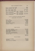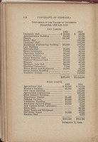 COMPARISON OF THE VALUES OF UNIVERSITY BUILDINGS, 1909 AND 1919 CITY CAMPUS 1909 1919 University Hall $ 50,000 $ 44,000 Administration Building 34,000 31,000 Temple 100,000 91,000 Bessey Hall ....... 170,000 Chemistry Hall ....... 189,000 Mechanical Engineering Building 115,000 110,000 Law Building ....... 92,000 Nebraska Hall 21,000 15,000 Brace Laboratory 72,000 66,000 Pharmacy Building 40,000 30,000 Library Building 95,000 85,000 Grant Memorial Hall 20,000 17,500 Soldiers' Memorial Hall 28,000 24,000 Museum 48,000 45,000 Mechanic Arts Hall 26,000 24,000 Electrical Laboratory 7,000 6,000 Boiler House and Equipment 29,000 61,000 Social Science Building ....... 275,000 Teachers' College ....... 140,000 $685,000 $1,516,000 FARM CAMPUS 1909 1919 Agricultural Hall $ 60,000 $ 55,550 Women's Building 65,000 59,000 New Diary Building ....... 175,000 Agricultural Engineering ....... 165,000 Plant Industry Building ....... 84,000 Experiment Station 25,000 20,000 Judging Pavilion 30,000 27,000 Veterinary Building 12,500 11,000 Machinery Hall and Shops 10,000 8,500 Hog Cholera Serum Laboratory ....... 7,500 Horse Barn ....... 33,500 Boiler House and Equipment ....... 41,000 Old Boiler House 11,000 10,720 Machine Shed ....... 6,275 $213,500 $704,280 SHERLOCK B. GASS. -