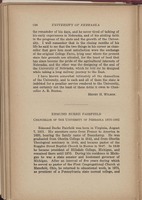 E. BENJAMIN ANDREWS CHANCELLOR OF THE UNIVERSITY OF NEBRASKA 1900-1908 Among the men who have built and served the University of Nebraska, one of the most dynamic personalities was Elisha Benjamin Andrews. A man of wide and rich personal experience, he had also a breadth and depth of scholarly training, a literary productivity, a range of interest, a wealth of imagination and of humor, a devotion to duty and vision, and a genius in moving and leading men which made him an outstanding figure in the educational life of the nation. Born at Hinsdale, New Hampshire, on January 10, 1844, he came into a family whose heads for two generations had been Baptist ministers of prominence. His brother, Charles B. Andrews, became governor of Connecticut in 1879-81. E. Benjamin began to prepare for college at the Connecticut Literary Institute. Interrupted, however, by the outbreak of the Civil War, he enlisted as a private in the First Connecticut Heavy Artillery. In two years he had risen to the rank of second lieutenant. He was wounded during the siege of Petersburg, in 1864, losing the left eye. Mustered out, he resumed his studies, graduating at Brown in 1870, and at the Newton Theological Institute in 1874. After a year in the pastorate at Beverly, Mass., he was called to the presidency of Denison University, at Granville, Ohio, and served there until 1879. Transferring back to Newton, he was for three years professor of homiletics. In 1882 he was appointed to the chair of history and political economy in Brown University. He spent the next year in preparatory studies in Europe. In his work at Brown his reputation was quickly established. The University of Nebraska gave him the degree of LL. D. in 1884. In 1888 he went to Cornell University, returning, however, in 1889 as president of Brown. The leadership of Dr. Andrews at Brown during the ensuing nine years gave new life and power to the institution. Attendance of undergraduate men rose from 276 to -