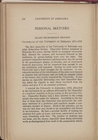 PERSONAL SKETCHES ALLEN RICHARDSON BENTON CHANCELLOR OF THE UNIVERSITY OF NEBRASKA 1871-1876 The first chancellor of the University of Nebraska was Allen Richardson Benton. Chancellor Benton remained at Nebraska five years, during which he equipped University Hall, planned the campus, and increased interest in the institution by speech-making tours over the state. The period of Chancellor Benton's administration was the period of the grasshopper pague [sic], of drouths, and of consequent financial depression, but he remained long enough to see the institution well launched. During its early years the University had a hard struggle for its existence. A considerable portion of the inhabitants of the state were housed in dugouts and sod houses, and yet with an unusual vision of the future, they loyally sustained the University. It was during an especially distressing year that Chancellor Benton asked the regents to take about one-third from his salary and give it to an assistant professor. I entered the University in September, 1873, attracted to the institution by an address delivered by the Chancellor at a teachers' institute in Sarpy county in the previous winter. Chancellor Benton took a keen interest in the young people who came under his influence. According to the custom of those days the Chancellor also performed the ordinary functions of a professor and regularly taught a considerable number of classes. Bred to the ministry, yet he was for that time very broad in his sympathies and liberal in his toleration. He had a peculiar faculty of making his students feel quite at home, and many appreciated an intimate friendship with him. The number of students was not large, and the classes, especially those doing university work, as distinguished from work in the preparatory school, -