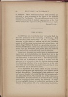 of students. Their multifarious types and activities are surveyed to best advantage in the pages of the students' annual, The Cornhusker. The varied interests and the increasing membership of student organizations at the University parallel the expansion of the institution as a whole. Louise Pound. THE ALUMNI In 1873 two men went forth from University Hall, the first two graduates of the University of Nebraska. Both men are living and active today—the one, J. S. Dales, as secretary of the board of regents and of the University senate, is still devoting his services to his Alma Mater; the other, Judge William H. Snell, is a practicing attorney at Tacoma, Washington. From two, the roster of alumni has grown into the thousands, until today they are scattered in all parts of the world and all lines of activities. Some seven thousand men and women are graduates, and many more as non-graduates, are doing their bit in the world's work the better for their training at the University. "By their fruits ye shall know them." The strongest argument that can be adduced in support of a state loyal and generous to its university is the fact that the leaders among its citizenship, whether it he on the farm or in the city, very often are University men and women, serving in turn the state that has so well served them. It is impossible in a short article to pay individual tribute to all the men and women who have reflected honor on their Alma Mater. Parenthetically, and speaking of men and women, it ought to be noted that the first woman graduate, Alice May Frost, '76, married one of her classmates, George Elliot Howard, thereby, as it were ab initio, setting such example as many another has followed. In truth, it is no negligible feature of coeducation, and hence of the interest of the alumni life of a coeducational institution, -