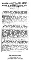 A New York Times article depicting the struggles the University of Nebraska face in raising money for the Temple Building project because of the disdain for Rockefeller's business.