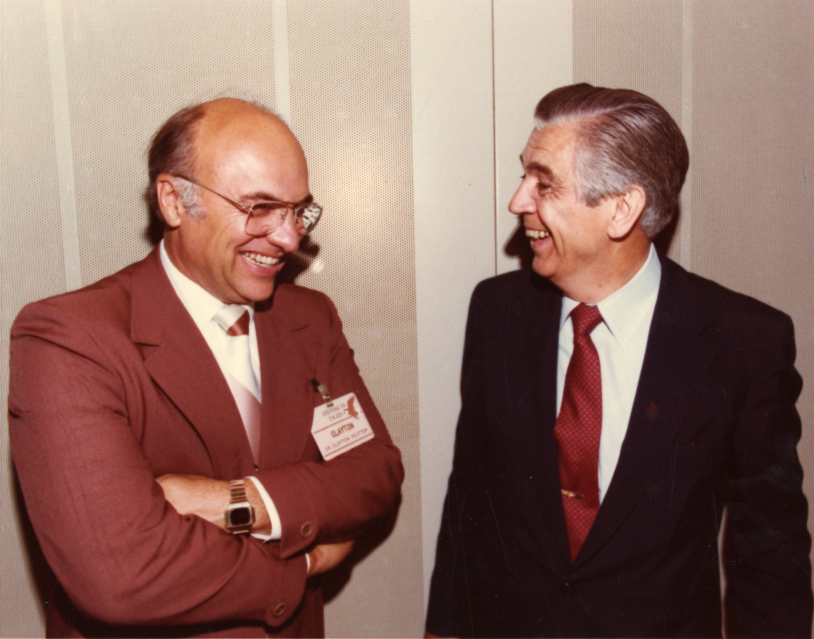 Clifford Hardin and Clayton Yeutter stand together laughing.