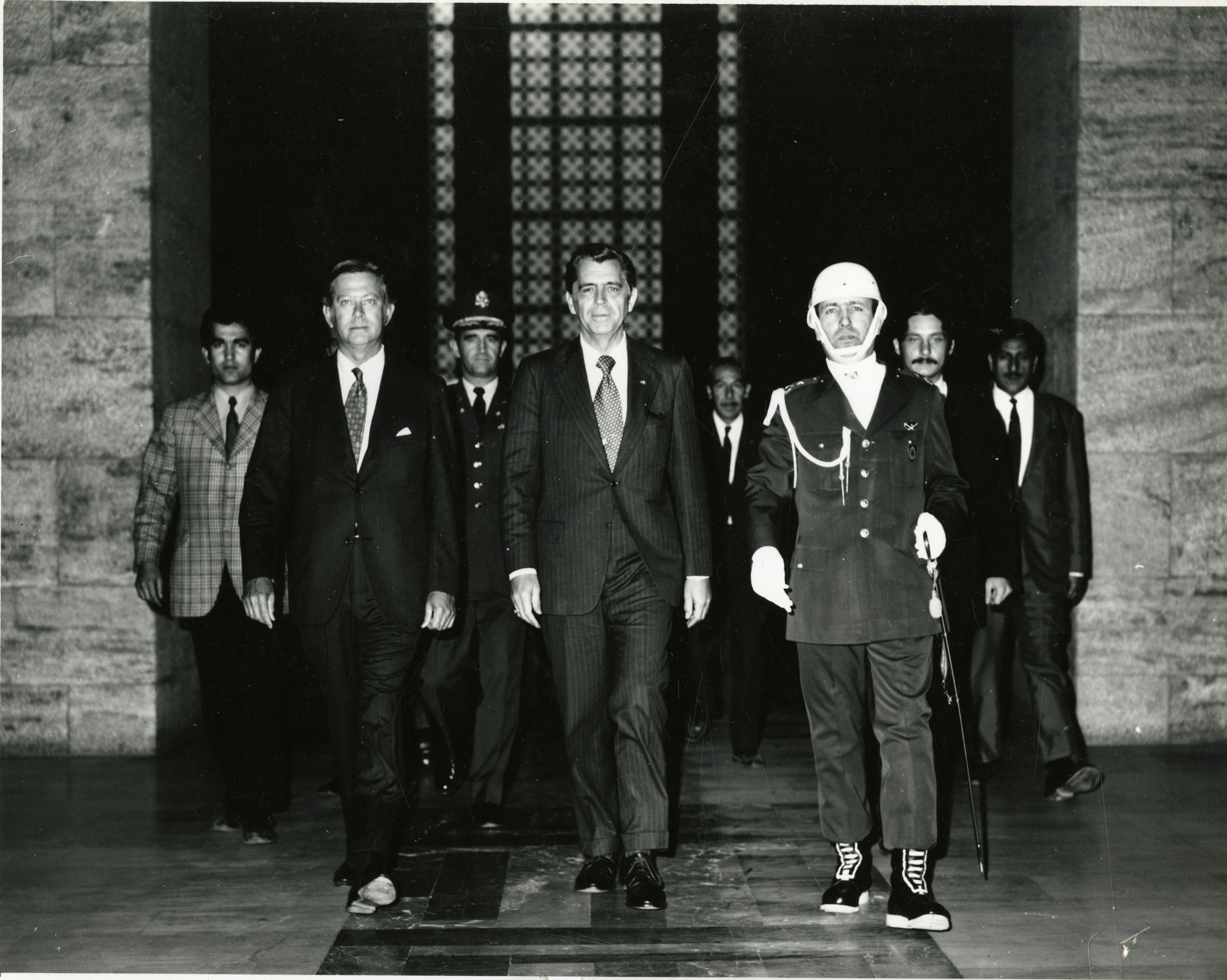 Clifford Hardin walks out of building doorway with two unidentified men, on is a guard, in Turkey.