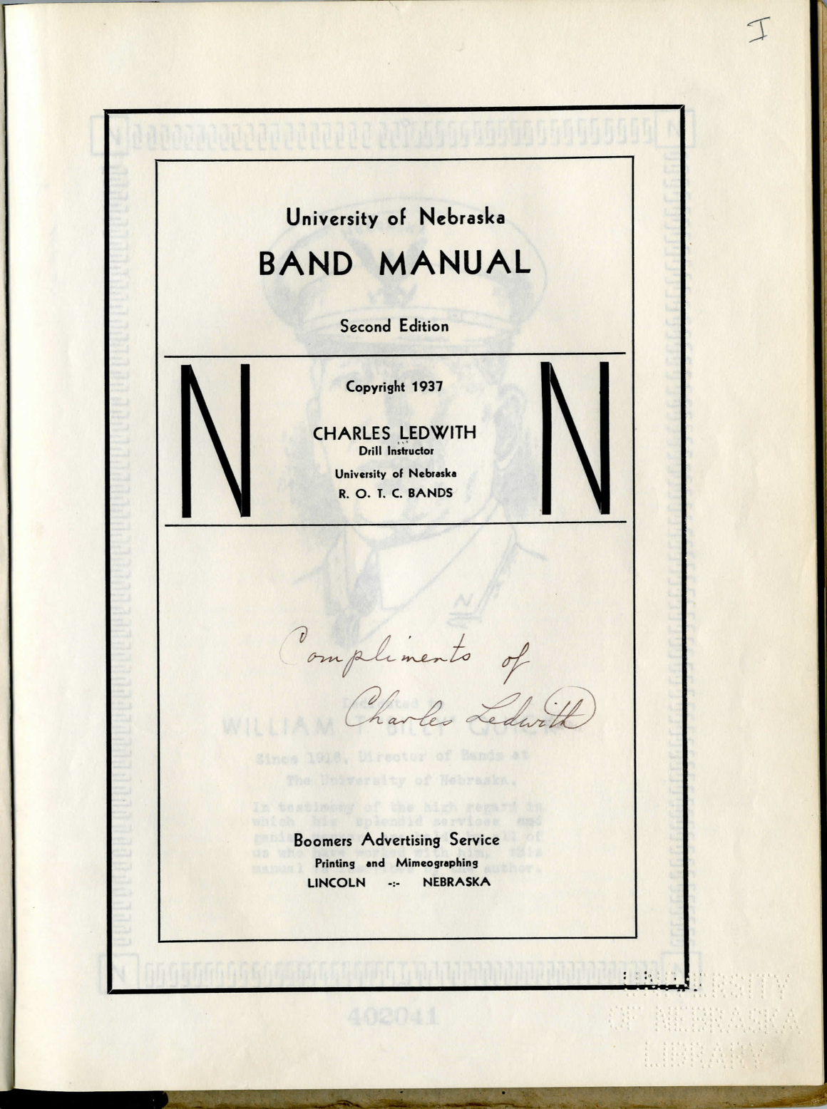 - The cover page of Charles Ledwith's R.O.T.C. Band Manual for the freshman band at the University of Nebraska.