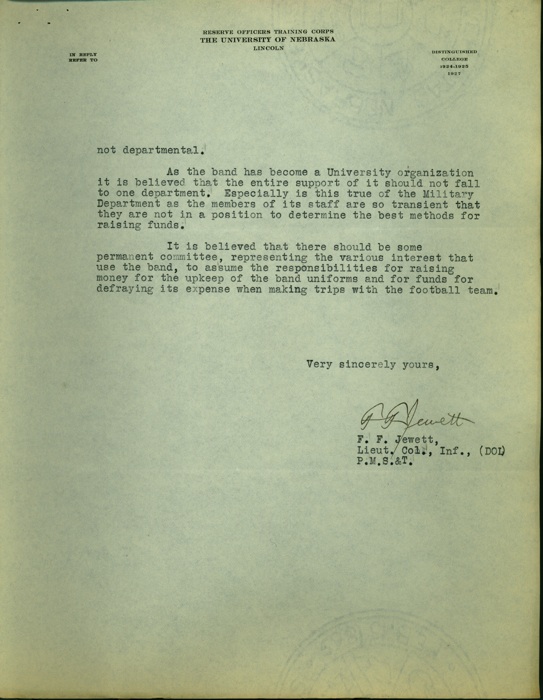 Letter from Lieut. F. F. Jewett to Chancellor Burnett, December 27, 1928 calling attention to the role of the band as a university organization and therefore the need for the university to support the R.O.T.C. band with funds for uniforms and travel arrangements.
