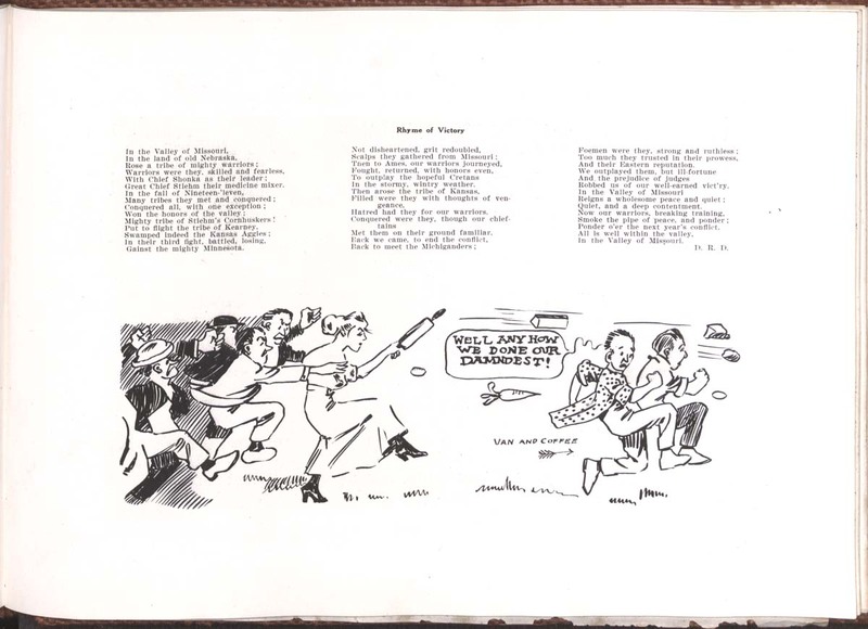 - Cartoon showing an angry mob chasing Van Dusen and another member of the Cornhusker staff as they shout "Well Any How We Done Our Damndest!" showing that the Cornhusker Staff knew they might upset people with their edition of the Cornhusker.
