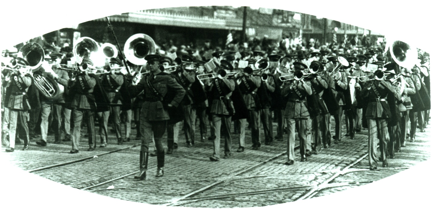 - Picture of Carrol Panley (drum major) leading the R.O.T.C. Band down "O" street in Lincoln, Nebraska during the 1929 Armistice Parade.
