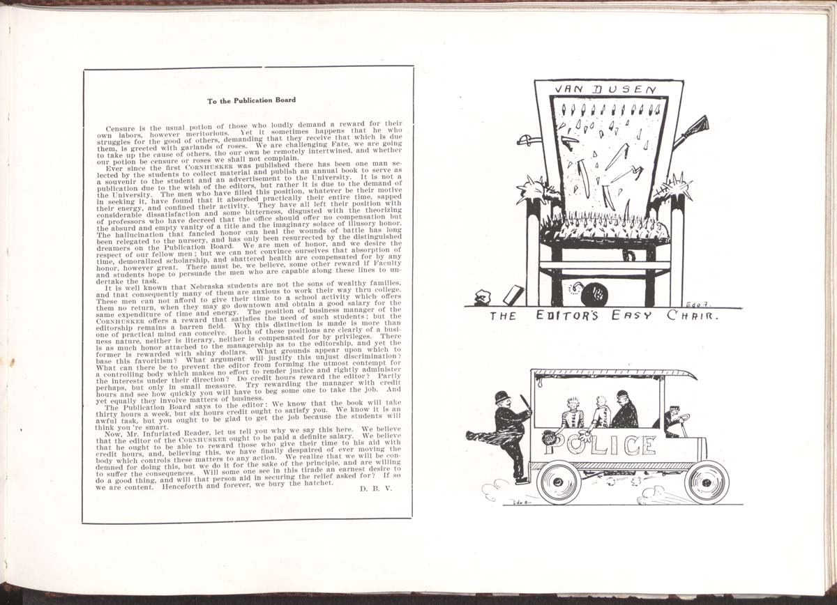 Ever since the first CORNHUSKER was published there has been one man selected by the students to collect material and publish an annual book to serve as a souvenir to the student and an advertisement to the University. It is not a publication due to the wish of the editors, but rather it is due to the demand of the University. The men who have filled this position, whatever be their motive in seeking it, have found that it absorbed practically their entire time, sapped their energy, and confined their activity. They have all left their position with considerable dissatisfaction and some bitterness, disgusted with the theorizing of professors who have decreed that the office should offer no compensation but the absurd and empty vanity of a title and the imaginary solace of illusory honor.The hallucination that fancied honor can heal the wounds of battle has long been relegated to the nursery, and has only been resurrected by the distinguished dreamers on the Publication Board. We are men of honor, and we desire the respect of our fellow men; but we can not convince ourselves that absorption of time, demoralized scholarship, and shattered health are compensated for by any honor, however great. There must be, we believe, some other reward if Faculty and students hope to persuade the men who are capable along these lines to undertake the task.