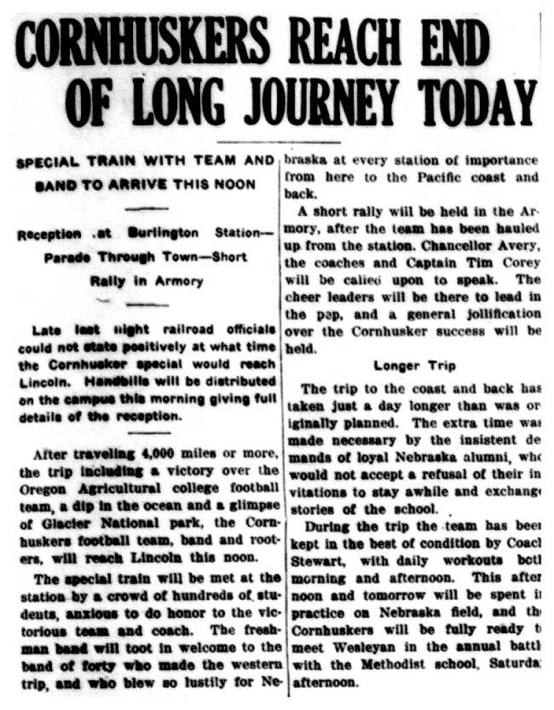 After traveling 4,000 miles or more, the trip including a victory over the Oregon Agricultural college football team, a dip in the ocean and a glimpse of Glacier National Park, the Cornhuskers football team, band and rooters, will reach Lincoln this noon.