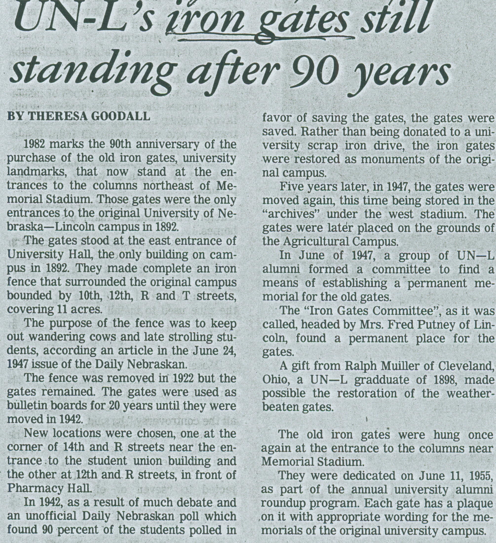 Goodall, Theresa. “UN-L’s Iron Gates Still Standing After 90 Years.†The Journalist, March 3, 1982. Building and Grounds files, Box 8, “Gates (Old Iron)†Folder, Archives & Special Collections, University of Nebraska-Lincoln, Lincoln, Nebraska.