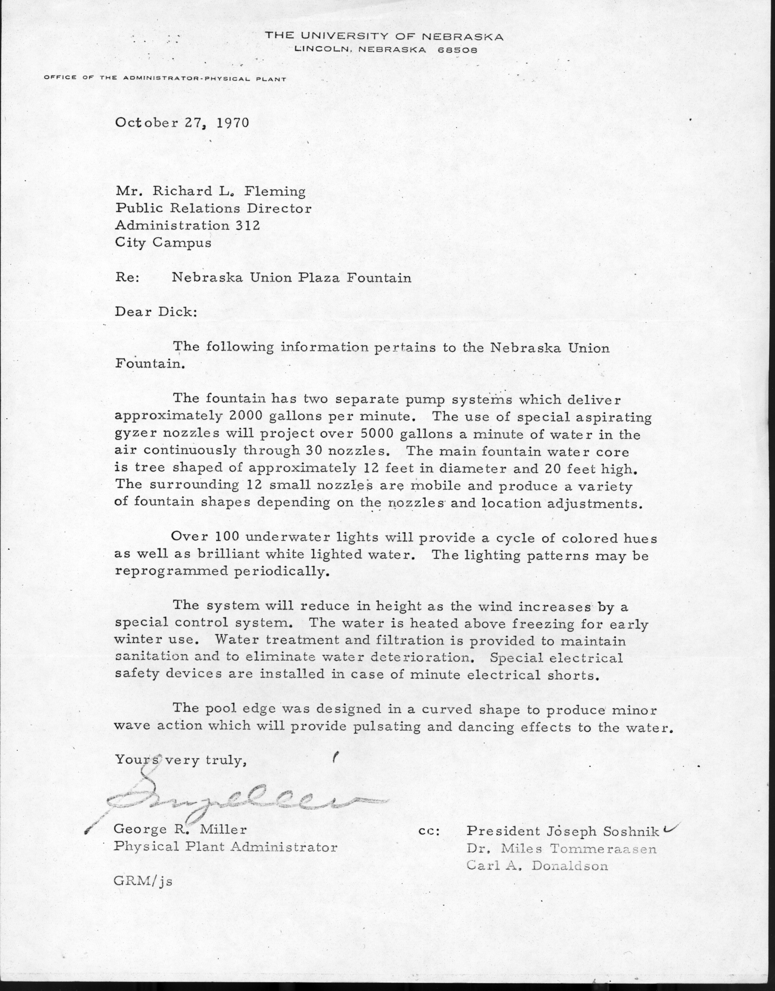 Correspondence between the Physical Plant Administrator, George Miller, and Public Relations Director, Richard Fleming, about the original Broyhill Fountain and many of its features.