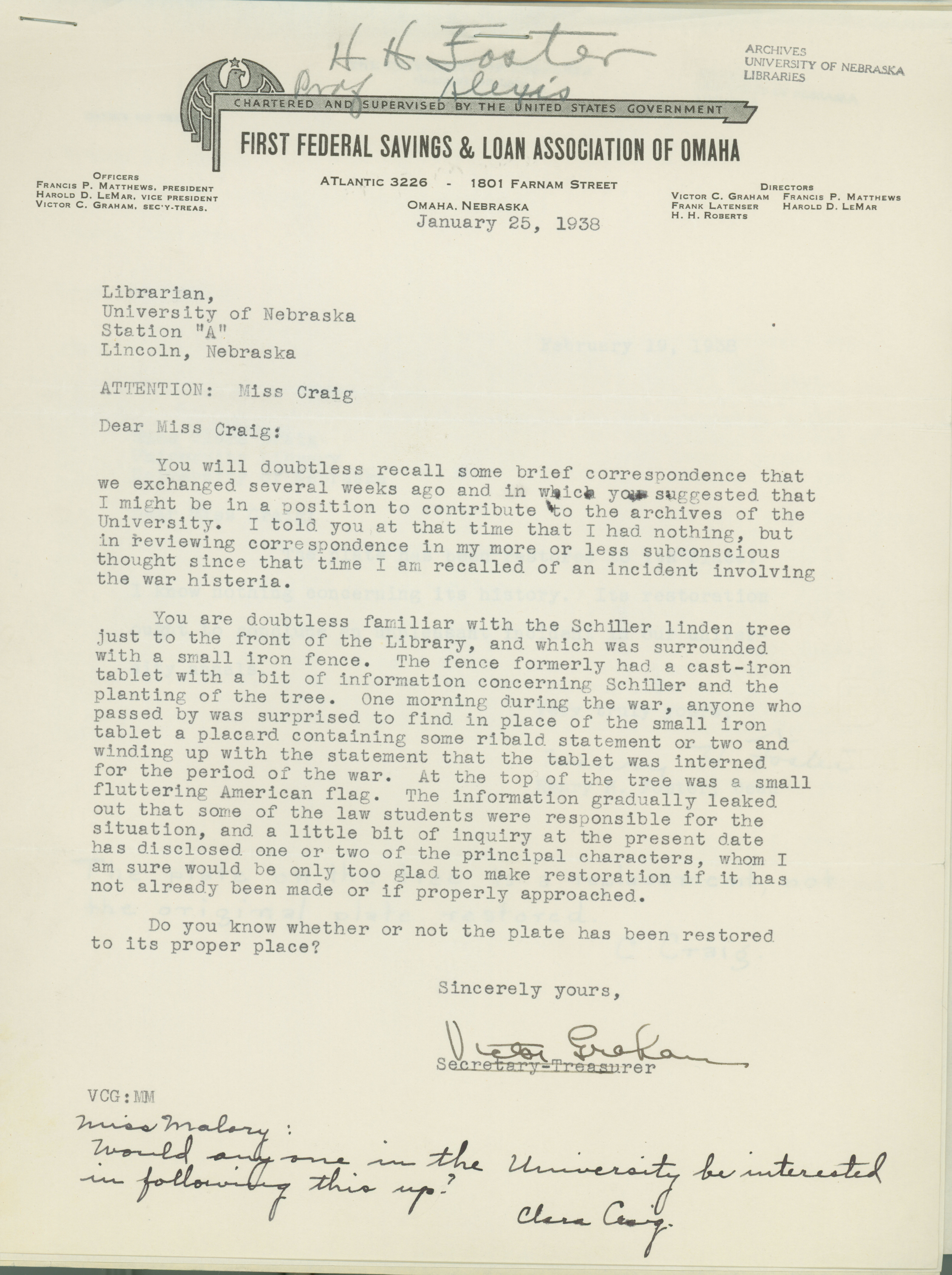 A letter from Victor C. Graham to "Miss Craig" discussing the defacement of the Schiller linden tree during his time at UNL.