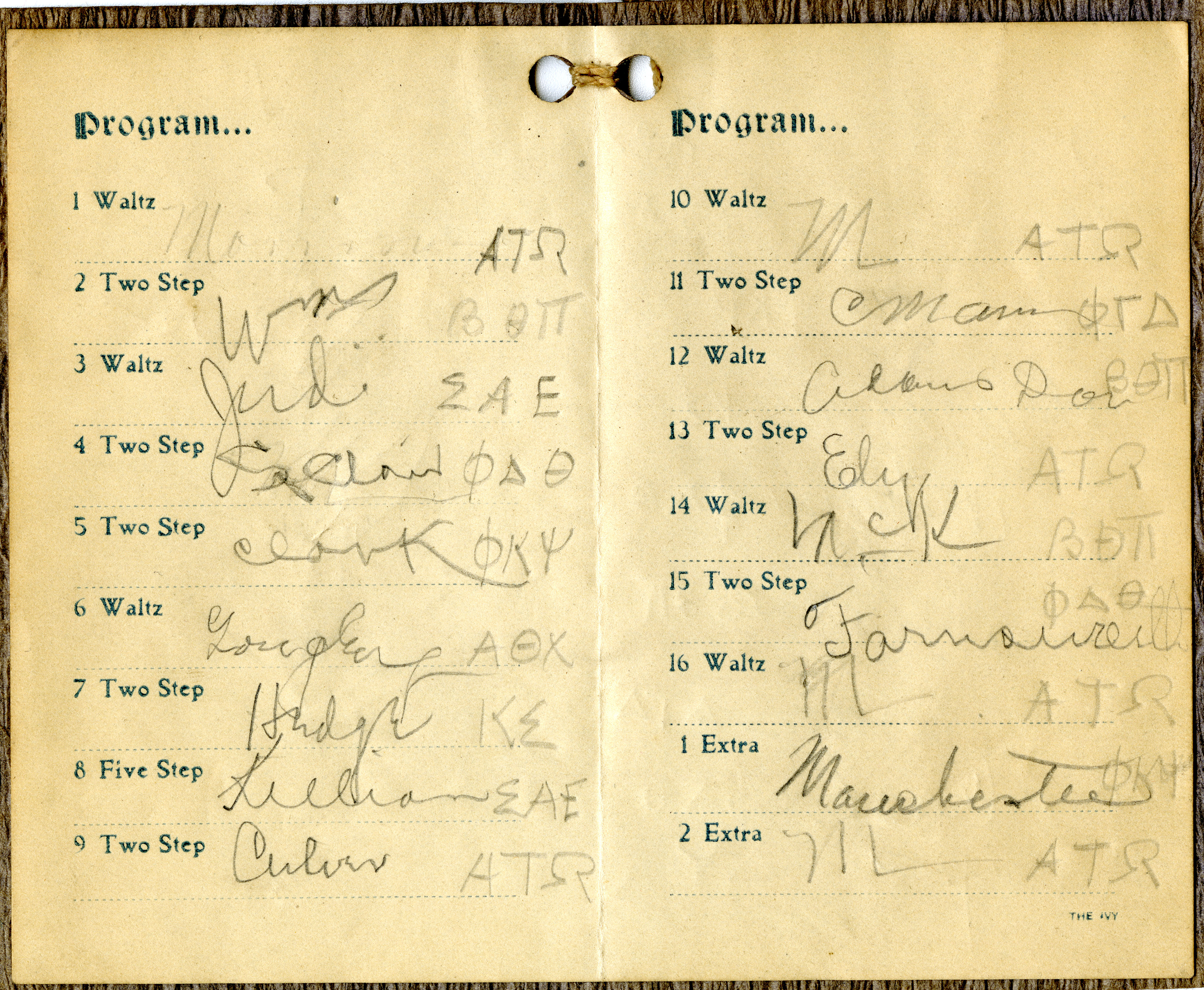 Bound by string with a thin leather cover, these dance cards were often used at dances held by the university or fraternal organizations. In this particular case, a fraternal organization put on the formal, as can be seen by the mens name behind the dance, with their Greek letters following their name.