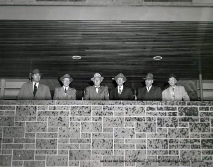 - Dedication of . Second from left, Franklin D Keim, far right, architect William Steele, third from right, John Selleck.