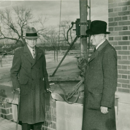- Don L Love and Chancellor Burnett at the laying of the cornerstone, Love Memorial Cooperative, 1940.